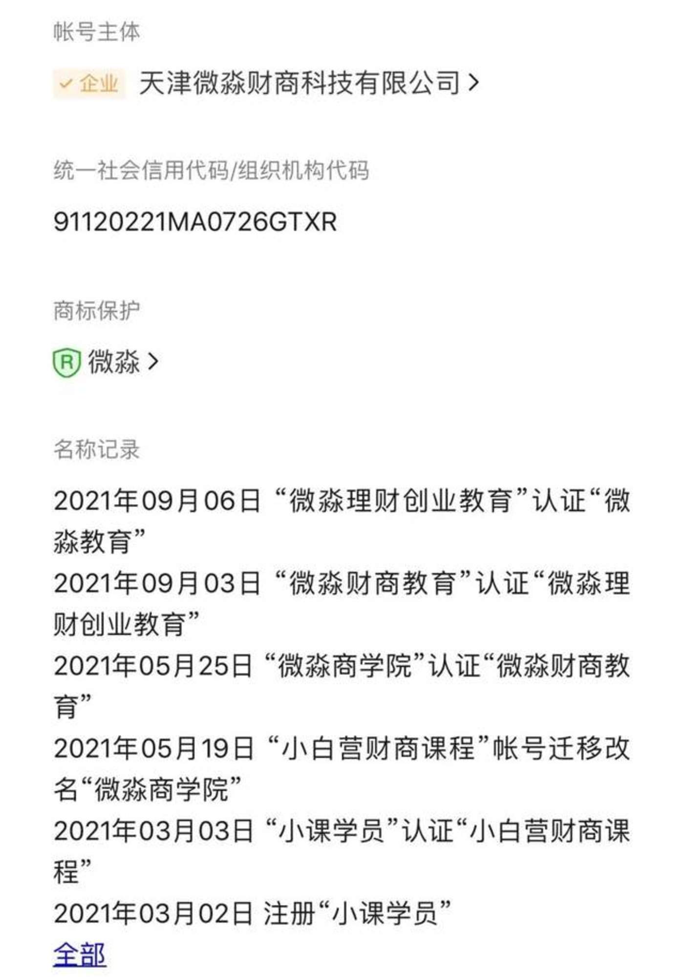 微淼的几次改名也能看出其转型之路,仅仅在9月份,它的认证名称就改了两次,从财商教育改成理财创业教育,再到范围更笼统的“教育”。