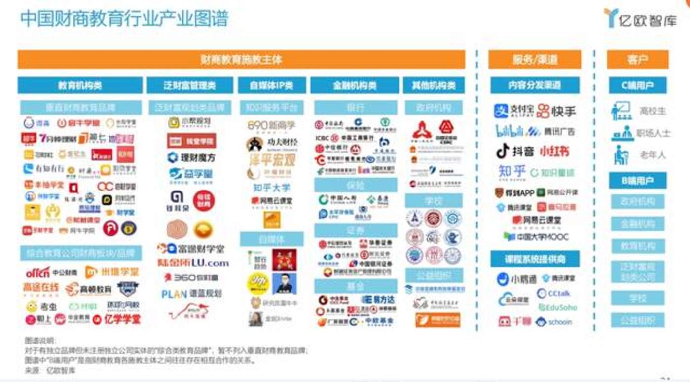 据亿欧发布的《2021年中国财商教育行业发展研究报告》,财商教育存在五大主体、三大商业模式。五大主体为教育机构类(包含垂直财商教育和综合类教育)、泛财富管理类机构、自媒体IP类、金融机构类和其他机构类。三大商业模式为分阶课程服务、付费课程与金融服务相结合、付费会员制。