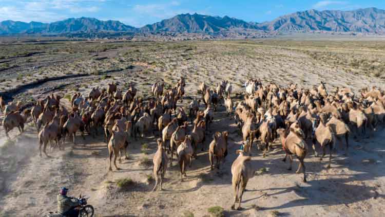 夏日里,甘肃省阿克塞哈萨克族自治县红柳湾镇加尔乌宗村牧民们赶着骆驼,从戈壁滩春季牧场转场到祁连山区的夏季牧场,让骆驼更好生长的同时也让牧场环境得到休养生息。夏日里,甘肃省阿克塞哈萨克族自治县红柳湾镇加尔乌宗村牧民们赶着骆驼,从戈壁滩春季牧场转场到祁连山区的夏季牧场,让骆驼更好生长的同时也让牧场环境得到休养生息。