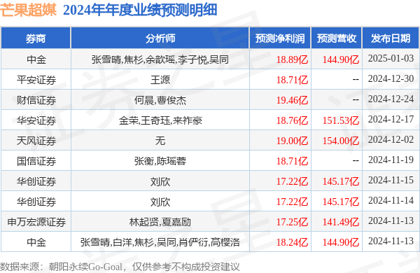 朝阳永续Go-Goal数据显示,此前市场对芒果超媒业绩的一致预期是:营业总收入为141.49亿元至160.44亿元;归属于上市公司股东的净利润为16.52亿元至20.4亿元。对比公告披露的数据,芒果超媒2024年年度业绩低于市场一致预期。
