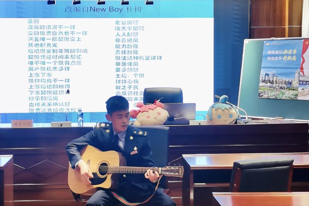 第四稽查局走进虹口教育局财务中心,给学校的会计人员开展了一场寓税于教的税宣活动。税务干部丰富活动内容,不仅有政策讲解,还改编一曲房屋转让政策,通过吉他弹唱的形式,将税收政策送入纳税人心中。