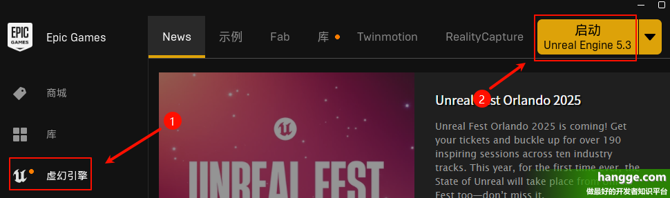 (1)点击 Epic Games 启动器左侧的“虚幻引擎”,然后点击右侧的启动按钮打开 UE5 编辑器。