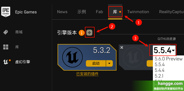 (3)如果有需要,同一台电脑可以同时安装多个版本的虚幻引擎。只需要切换到“库”选项卡,点击引擎版本旁边的加号,然后再新增的条目中选择需要的版本安装即可。