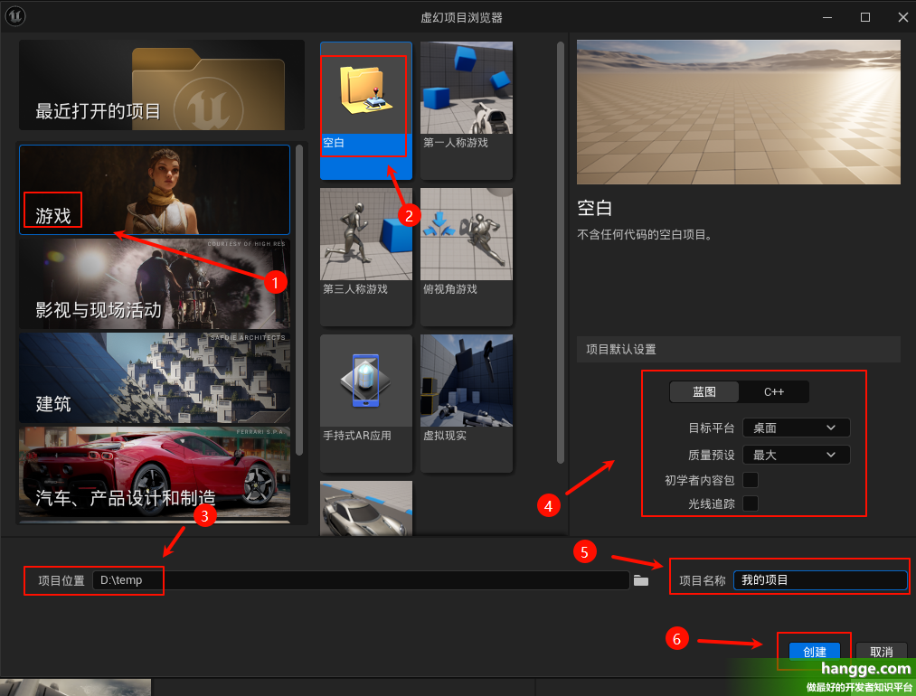 (2)打开后显示虚幻项目浏览器界面,点击 “游戏” 分类(默认选项)。 选择 “空白”模板,修改项目保存位置,根据需要还可以修改项目默认设置,然后修改项目名称后点击“创建”,等待项目初始化完成。