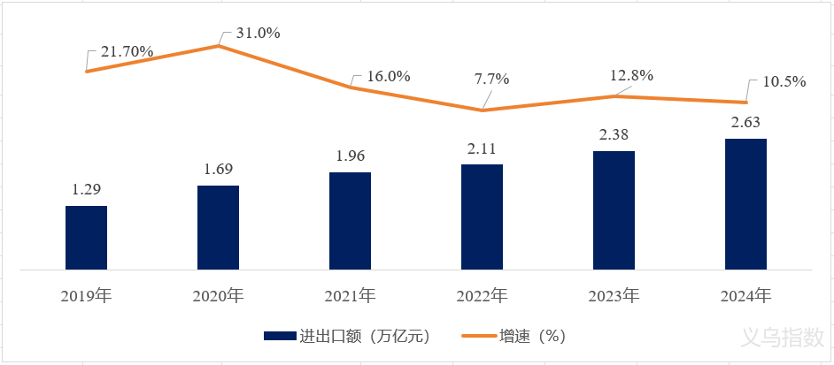 2021年,中国跨境电商进出口规模首次超过万亿元,达到1.44万亿人民币,2024年,我国跨境电商进出口额达2.63万亿元,同比增长10.8%。其中,出口2.15万亿元,同比增长16.9%。从行业整体规模看,近年来保持稳健且高速成长趋势,高于外贸整体增速也反映出在线上基础设施逐渐成熟的环境下,更多中小商家参与到出海大潮中。