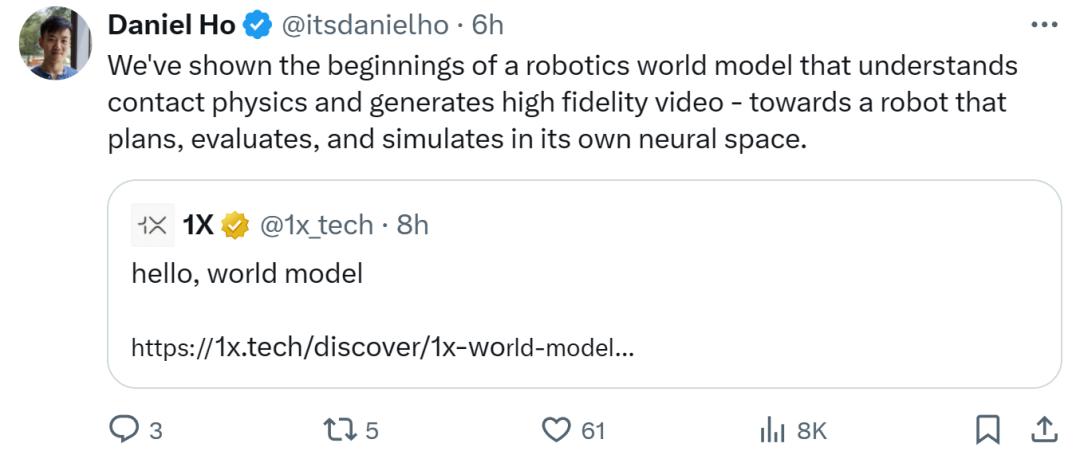 1X 工程师 Daniel Ho 表示这是机器人世界模型的初步进展,模型可以理解接触到的物理世界并生成高保真视频,使机器人可以在自己的神经空间中执行规划、评估和模拟操作。并且,很多生成的视频片段很难与真实视频区分开来。