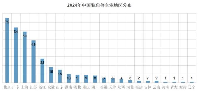 2024年中国独角兽企业分布于22个省、直辖市、特别行政区。其中,“北上深”成为独角兽企业的主要集聚地,分别拥有75家、59家、42家独角兽企业。另外,广东(64)、江苏(49)等地区的独角兽企业数量也均超30家。其次,浙江28家、安徽18家、山东15家,湖南10家、湖北、重庆各9家、四川8家、香港6家、天津5家、陕西4家、河北3家,福建、吉林、云南各2家,河南、青海、海南、辽宁各1家。
