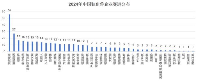 2024年中国独角兽企业分布于41个赛道。其中,集成电路上榜企业最对,为56家,其次是清洁能源,上次企业数为27家,第三名是创新药,上榜企业数为17家。此外,动力电池、企业数字运营、数字文娱、自动驾驶等赛道的独角兽企业数量均在15家及以上。