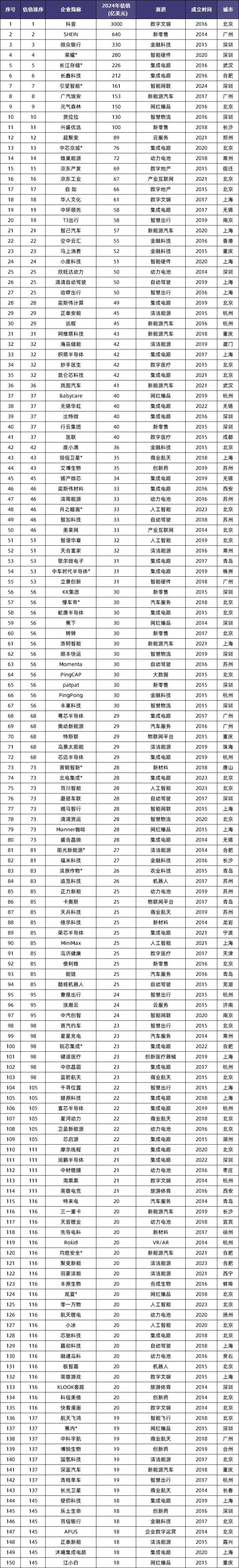 2024年中国独角兽企业共372家,总估值超1.2万亿美元,平均估值33.4亿美元。其中,11家超级独角兽企业贡献了超4成估值,整体达到5385亿美元。同时,还有53家新晋独角兽企业,并有荣耀、长江存储、引望智能等3家新晋企业成为超级独角兽。