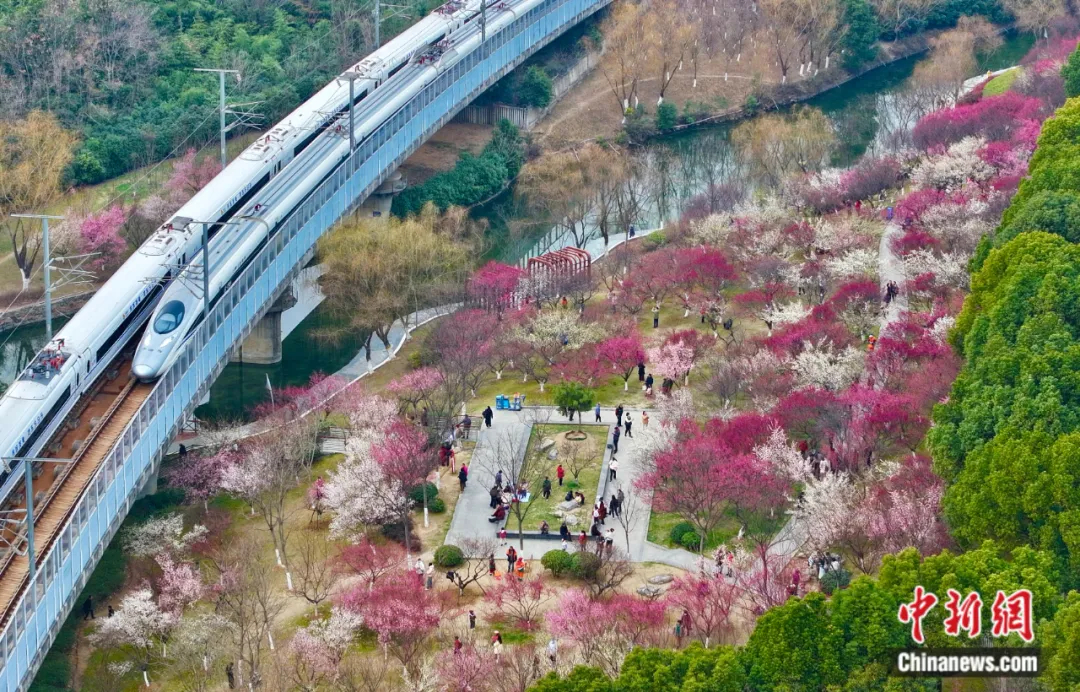 高铁驶过春意盎然的公园,游客在花海漫步赏梅。(无人机照片)中新社记者 韩苏原 摄