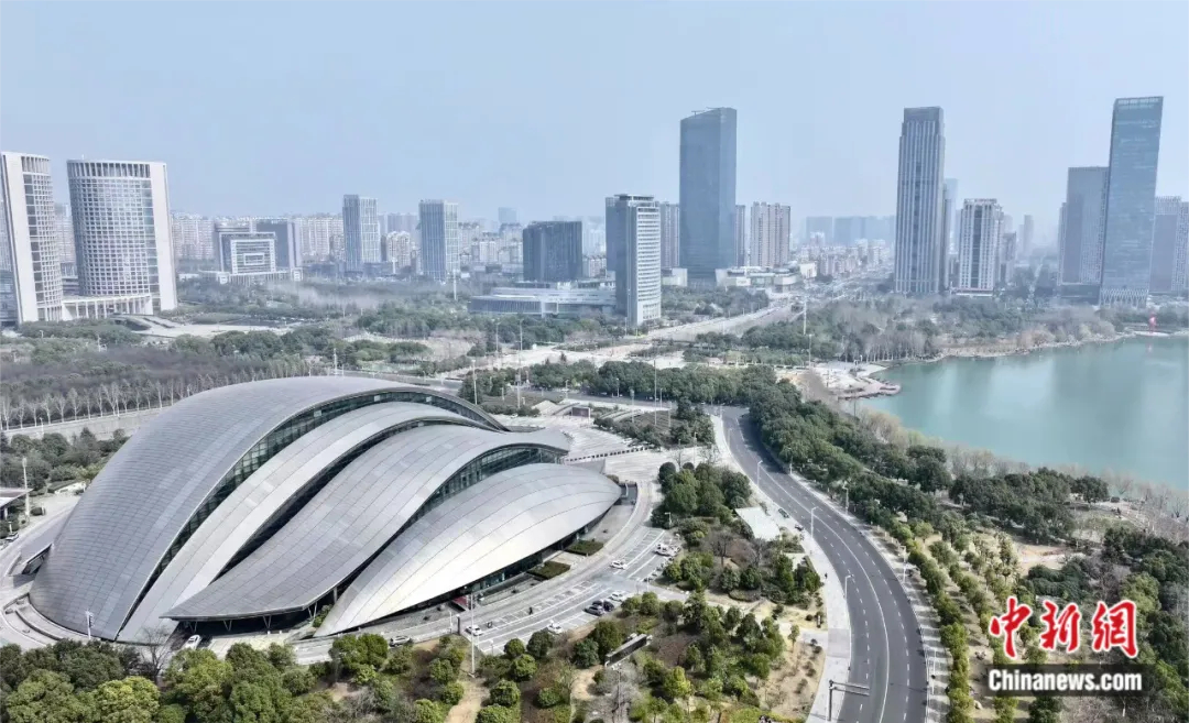 安徽省合肥市巢湖岸边生机盎然、春景如画,岸边的民居与宽广的湖水、环巢湖公路交相辉映,宛如一幅画卷。(无人机照片)中新社记者 韩苏原 摄