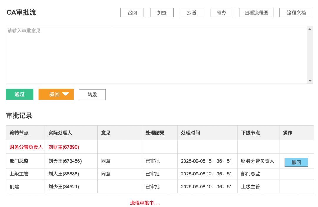 前面我们聊过了OCR智能识别技术,下面来聊聊OA审批引擎,它也是企业经营生产中一项重要工具,起到了风险可见、风险可控、风险可分摊、降低运营成本、权责清晰、赋能管理决策。下图PC端OA审批流(移动端审批也很重要)。