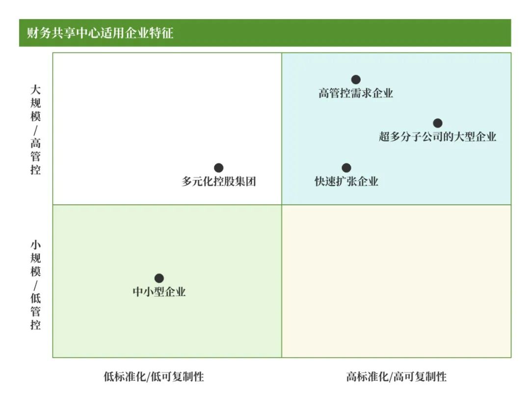 当然FSSC并非所有企业都适用,它有其明确的适用边界,具备以下特征的公司更适合且更能从财务共享中心获益。