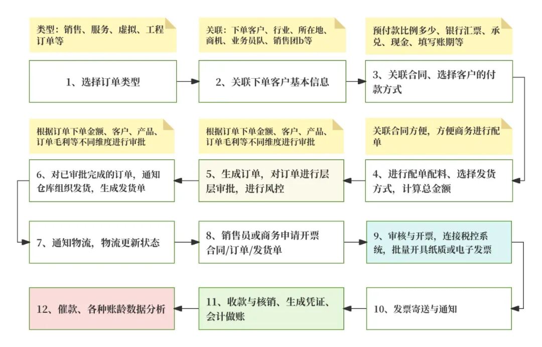 为了更好了解大B企业的应收款项流程,以上市大型某钢结构企业为例,B2B企业不同于C2C,订单远比它复杂得多,大B企业的订单在下单人、内容、类型、配单、另外更需要层层审批后才发货 -> 物流 -> 对账 -> 开票申请 -> 开票 -> 收款  ->  财务”,如下图所示。