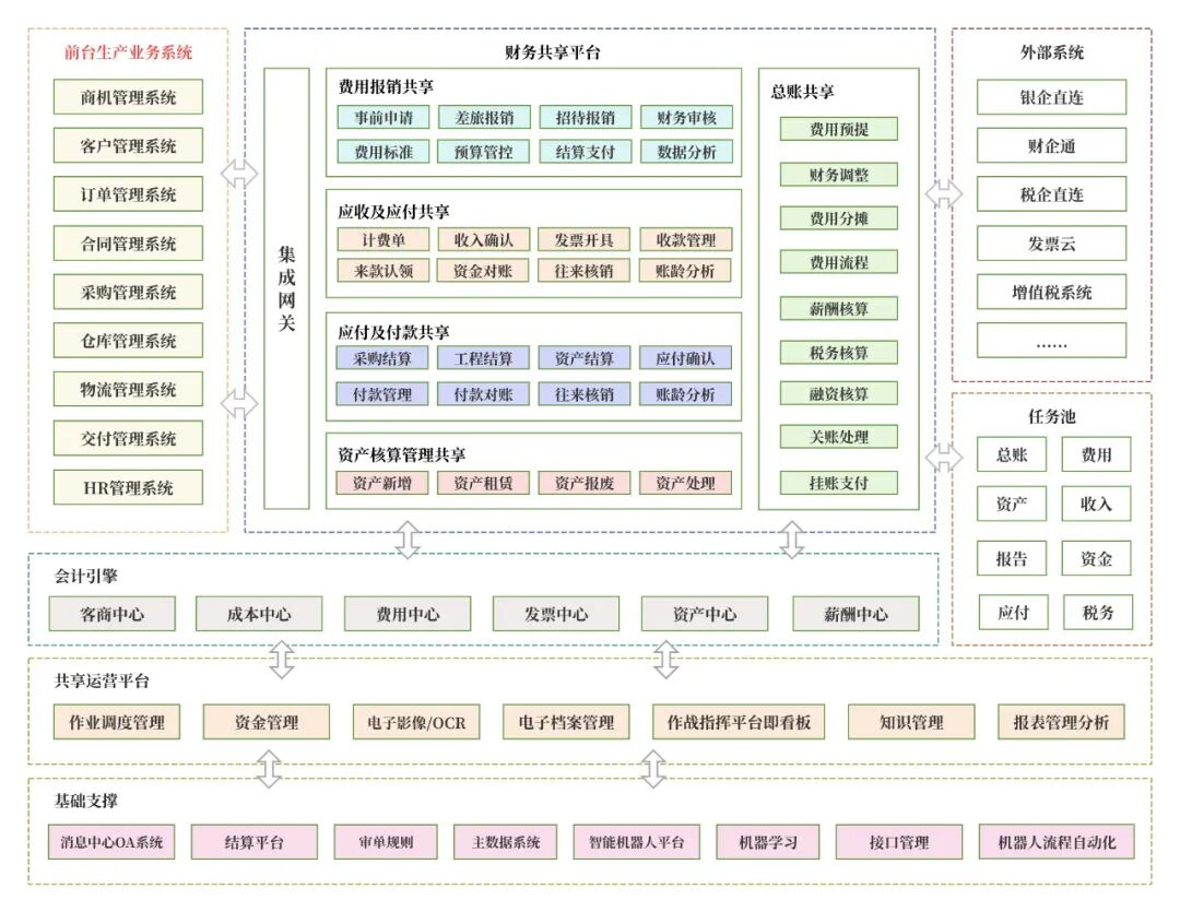 通过上图就能直观感受到:财务共享中心整个支撑系统的复杂性和庞大性,围炉抽丝剥茧,化繁为简:前端交互层、流程与应用层、技术赋能层、数据与集成层4大模块以及相应的系统。