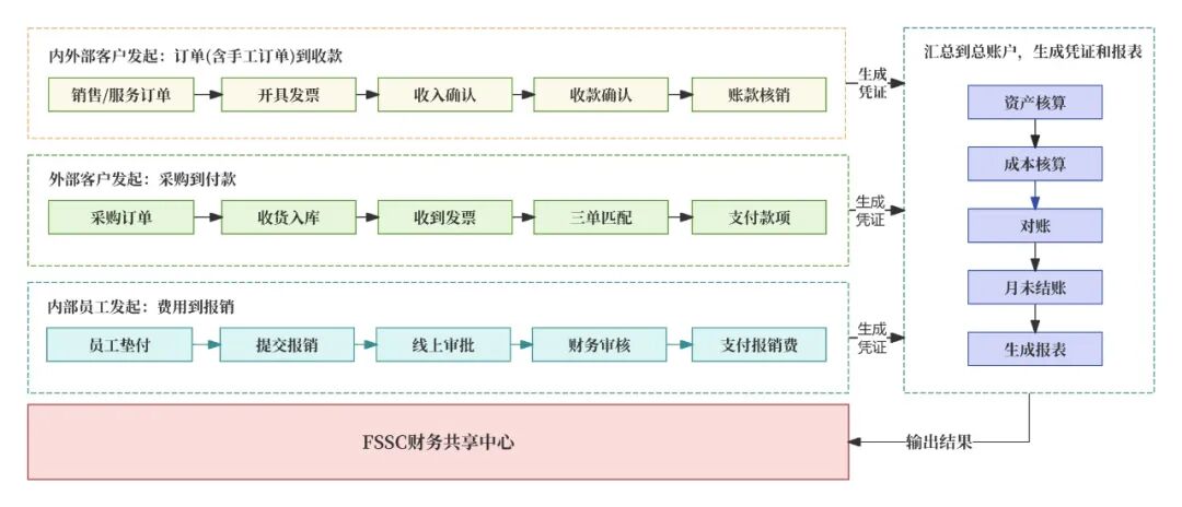 2.1、概念:财务共享中心(Financial Shared Service Center, FSSC)是现代企业财务管理的重要模式,核心是通过集中化、标准化、数字化的手段,将企业内各分子公司重复性高、标准化程度高的财务流程集中处理,实现降本增效、强化管控、提升财务价值的目标。