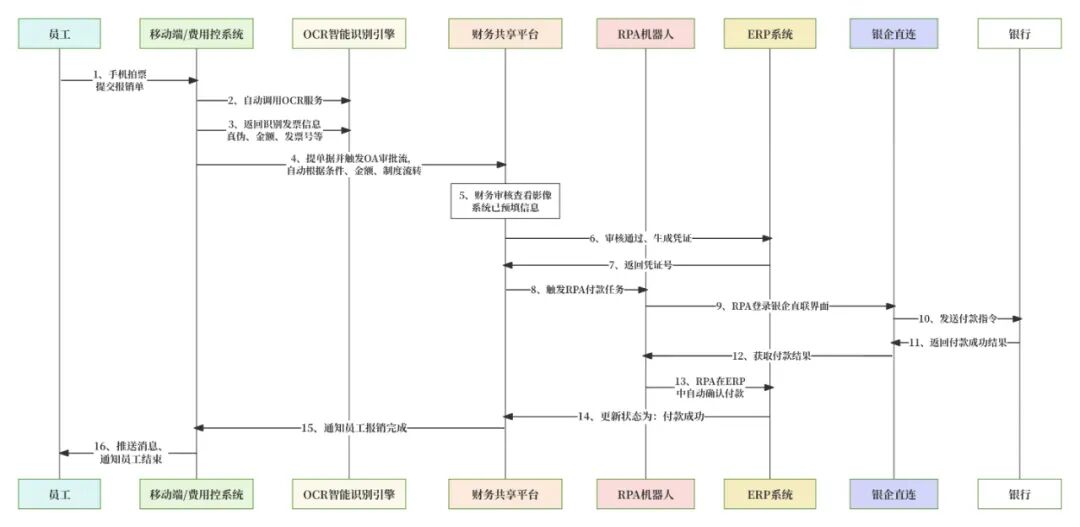 5.5.2、员工报销时序图:我们就以上面经典的 “员工报销” 流程为例,来看财务共享平台中各系统是如何协同工作、赋能公司降本增效,如下图所示: