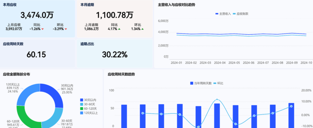 1、账龄结构分析:找出逾期的风险,0-30 天(信用期内)、31-60 天(轻度逾期)、61-90 天(中度逾期)、超过 90 天(严重逾期),然后系统自动算每个层级的金额占应收账款总额的百分比,账龄结构能直接反映账款收回的紧急程度和风险大小。