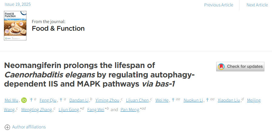 Wu M, Qiu F, Li D, et al. Neomangiferin prolongs the lifespan of Caenorhabditis elegans by regulating autophagy-dependent IIS and MAPK pathways via bas-1. Food Funct. 2025;16(19):7690-7704. Published 2025 Sep 29. doi:10.1039/d5fo02007g