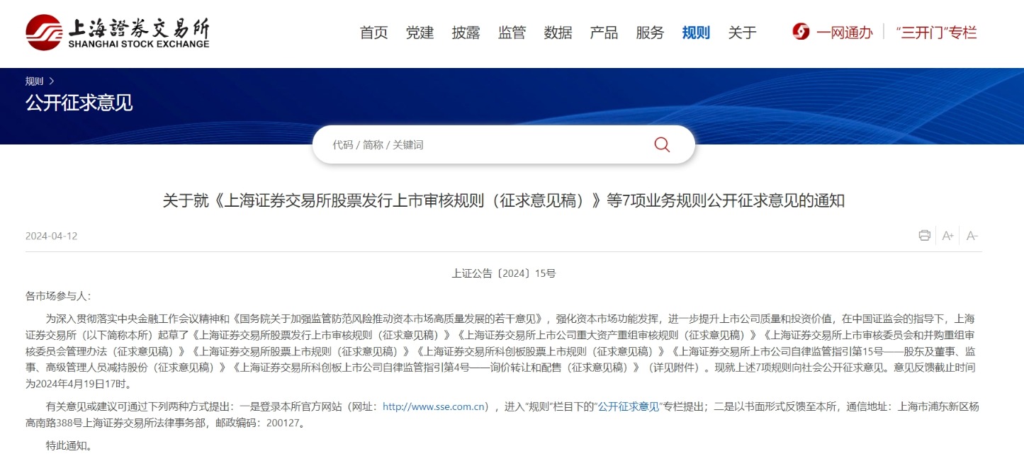 上交所发布关于就《上海证券交易所股票发行上市审核规则(征求意见稿)》等7项业务规则公开征求意见的通知。