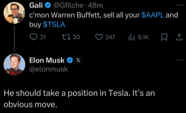 当地时间5月6日,海外某社交媒体一名用户评论称:“巴菲特应该清仓苹果,买入特斯拉。”马斯克回复该评论称:“他(巴菲特)应当建仓特斯拉,这是显而易见(正确)的决策。”