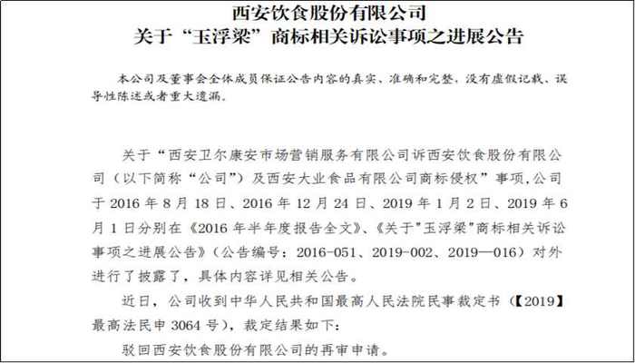 3月21日,西安饮食发布公告发布“玉浮梁”商标相关诉讼事项之进展公告,“西安卫尔康安市场营销服务有限公司(简称卫尔康安公司)诉西安饮食股份有限公司(简称西安饮食)及西安大业食品有限公司(简称大业公司)商标侵权”一案,最高人民法院驳回西安饮食的再审申请。至此,“玉浮梁”商标案纠纷落幕。