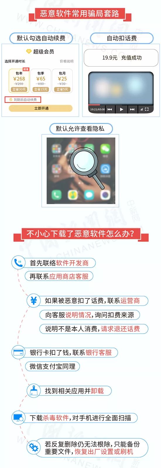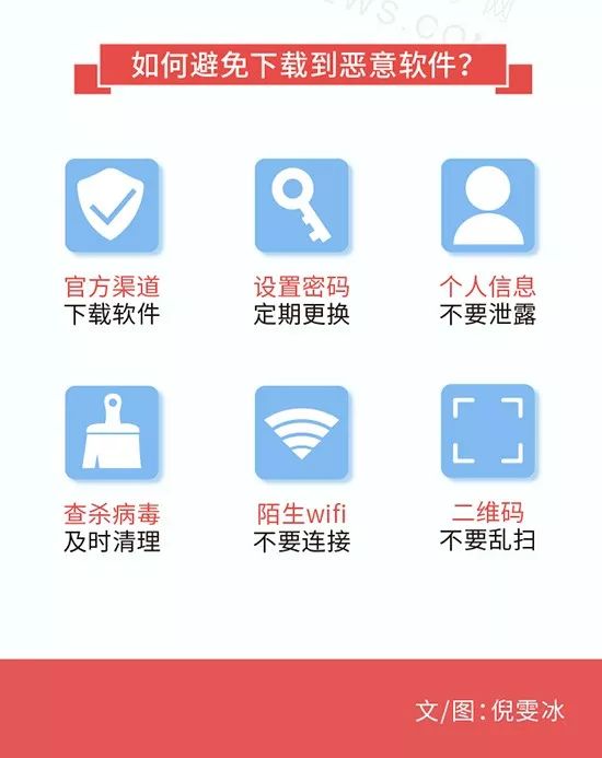 在不轻易泄露个人信息的同时,大家还要注意,小心自己的手机被恶意软件入侵,避免一步步落入诈骗的陷阱,下面这张长图,就清楚描述了恶意软件的“袭击”流程,赶紧分享给家人和朋友,远离各种恶意软件