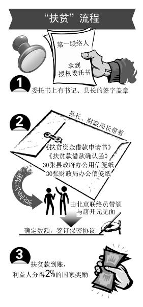 第二步,需要县长与当地财政局长随身携带《扶贫资金借款申请书》和《扶贫款借款确认函》前往北京,在北京的联络员带领下,与该协会直接扶贫办主任唐开元见面,确定扶贫款数额并签订保密协议。
